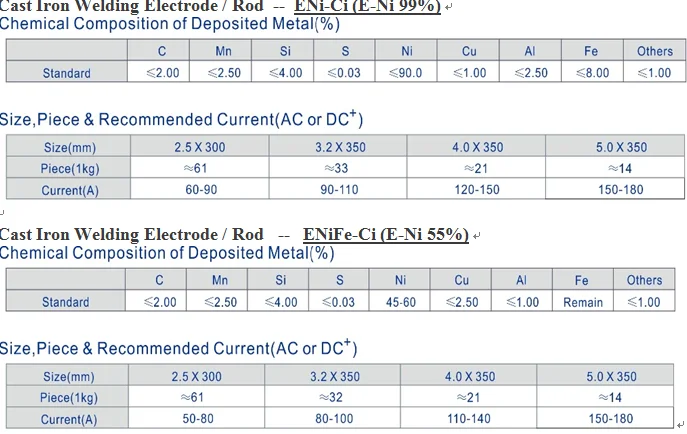 Cast iron electrodes nickel 99 nickel 55 non nickel est alloys description.